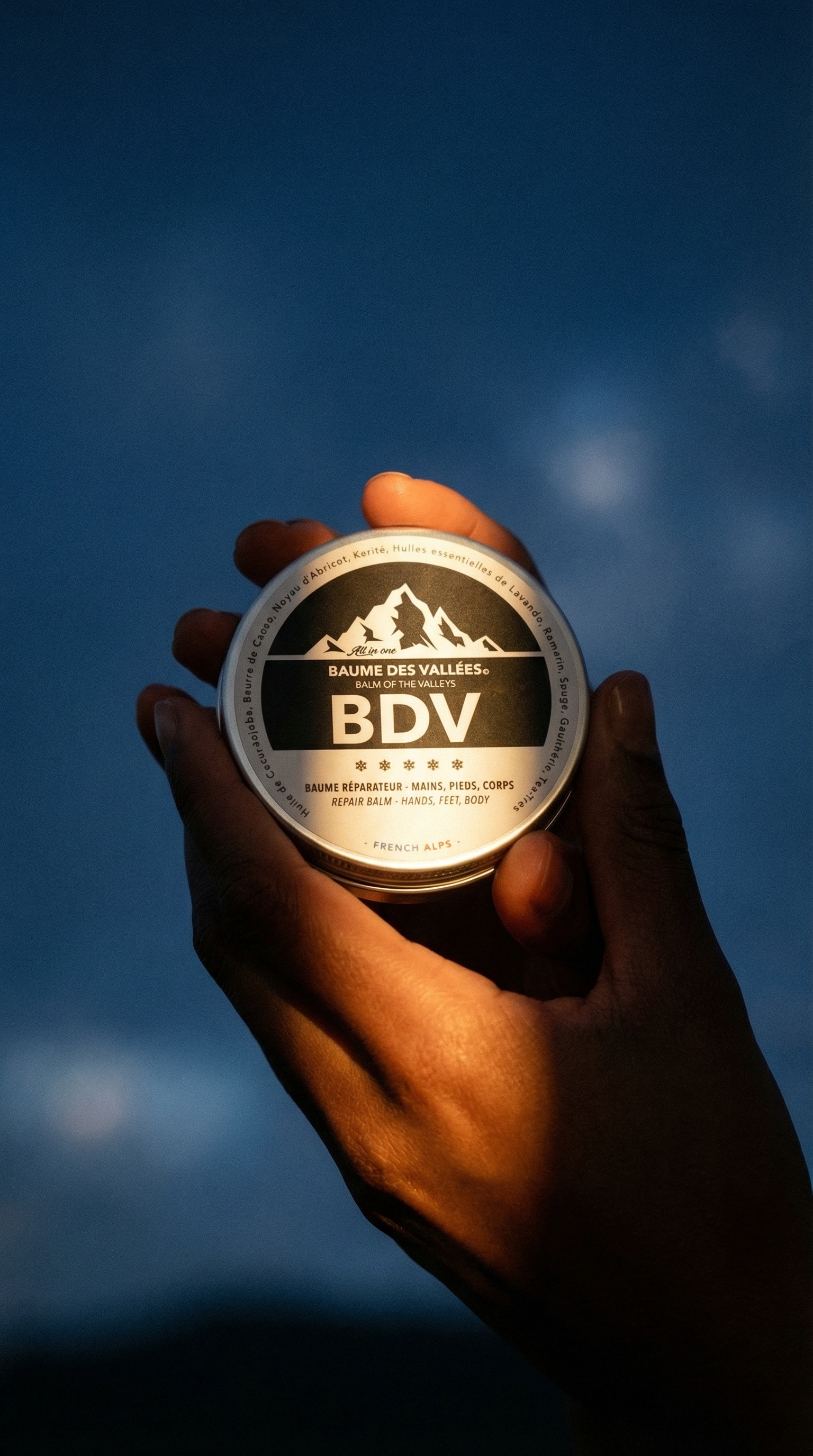 Nous avons alors imaginé un soin unique, polyvalent, efficace et 100 % naturel, sans eau pour limiter l’impact écologique. Après des mois de recherches, le Baume des Vallées (BDV) est né : un soin révolutionnaire « all in one » qui hydrate, protège et répare les mains, les pieds et même le corps. Compact, économique et ultra-performant, il est devenu un incontournable pour les sportifs, les voyageurs, et tous ceux qui privilégient des soins minimalistes et naturels.